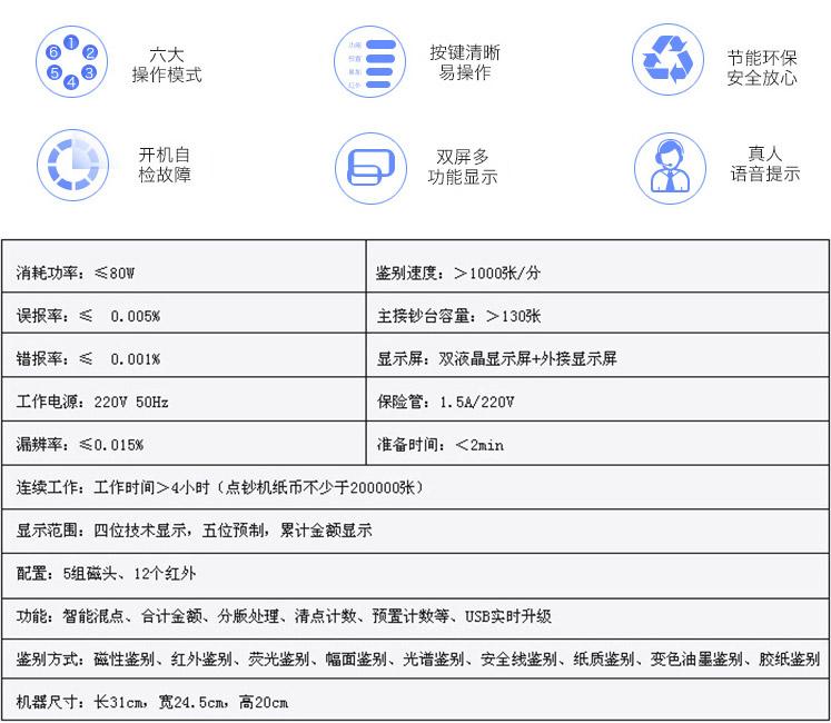 點鈔機類型: 插電式<br>屏幕數量: 雙屏<br>級別: B類<br>顏色分類: 銀黑色 灰黑色