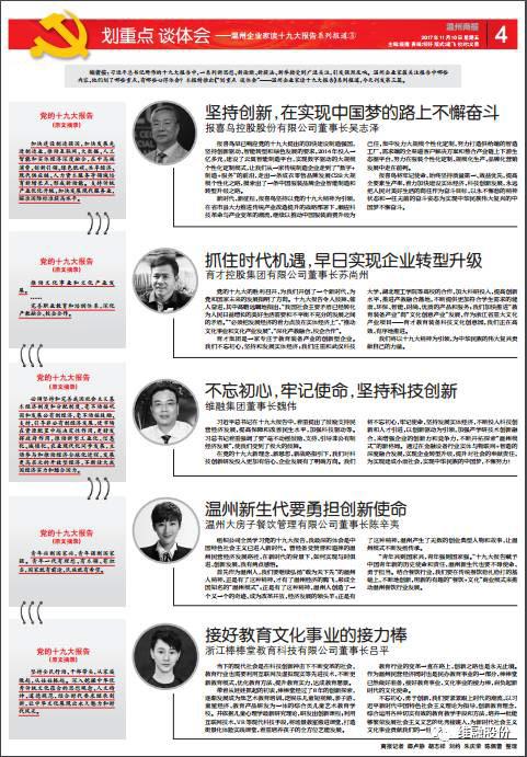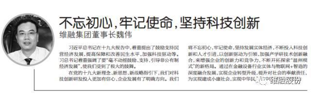 據悉,近日維融集團董事長兼維融股份公司總經理魏偉在接受溫州商報就“企業家讀十九大報告”采訪時,提出以“不忘初心,牢記使命,堅持科技創新”為核心的十九大報告體會。