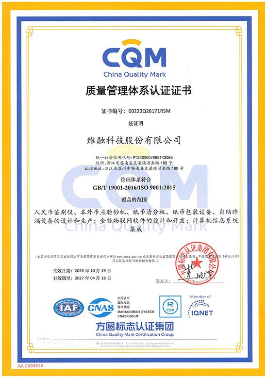 質(zhì)量管理體系CQM認(rèn)證證書