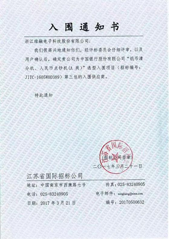 近日,我公司收到江蘇省國際招標公司發(fā)出的《入圍通知書》。在中國銀行股份有限公司“紙幣清分機、人民幣點鈔機(A類)”選型入圍項目(招標編號:JITC-1605WH0389)中,經(jīng)評標委員會仔細審查,以及用戶確認后,確定維融科技股份有限公司為第三包的入圍供應商,入圍產(chǎn)品為紙幣清分機、人民幣點鈔機(A類) 。