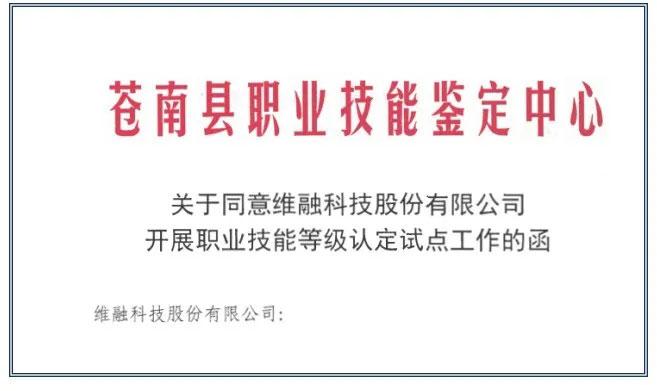 9月9日,蒼南縣職業技能鑒定中心發文同意維融科技開展職業技能(計算機及外部設備裝配調試員、信息通信網絡終端維修員兩個工種)等級認定試點工作。